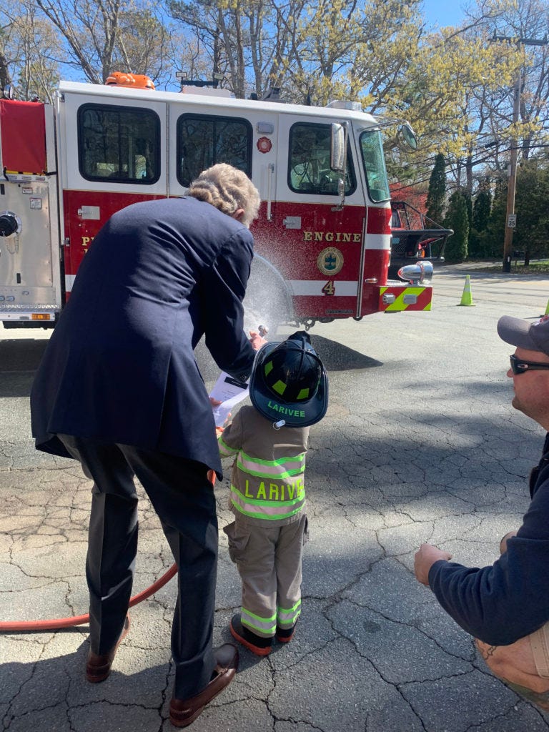 The chairman of the Plymouth Board of Selectman Ken Tavares and candidate for re-election this Saturday, welcomed the Town's newest fire truck Friday, along with Liam Larivee, son of Fire Fighter Larivee. The new truck, Engine 4, features a 1500 gallon per minute pump and 1000 gallon water tank plus a 10 kilowatt hydraulic generator.
